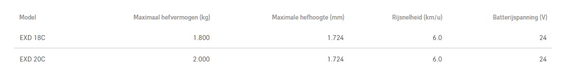 De EXD 18C‑20C levert topprestaties met dubbele stapelmodus voor flexibel gebruik. De krachtige, onderhoudsarme elektrische aandrijving en stuurmotor zorgen voor efficiënt werken. Met een accucapaciteit tot 375 Ah of Li‑ion optie is langdurige inzet gegarandeerd.