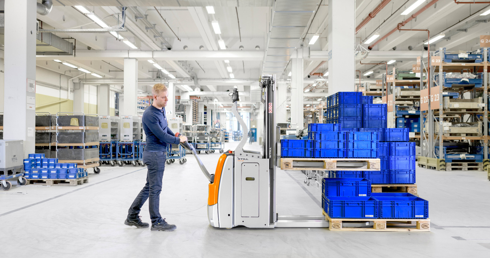 Ergonomische STILL-disselkop maakt bediening met één hand mogelijk. Compact ontwerp voor nauwkeurige manoeuvres in krappe ruimtes.