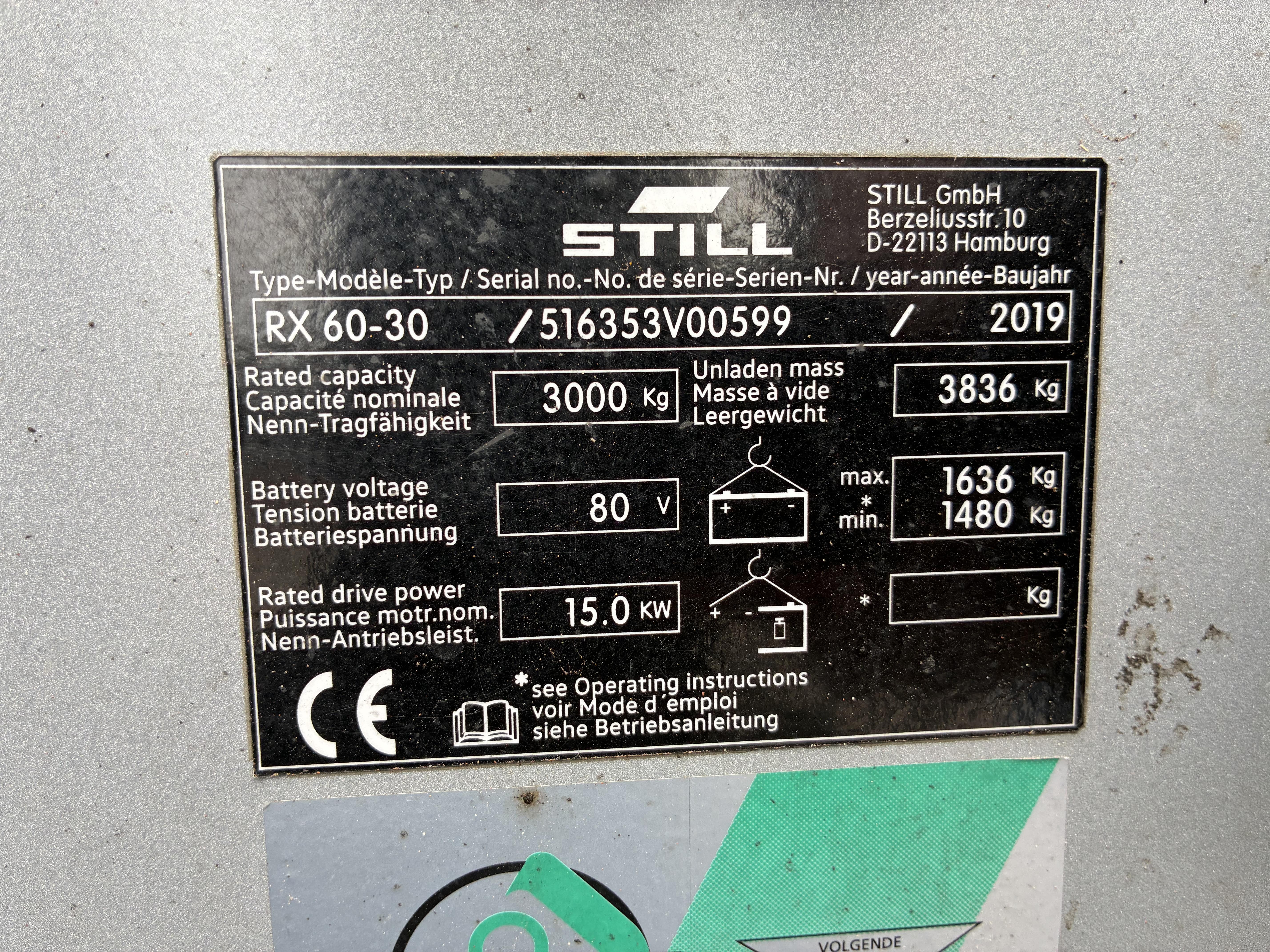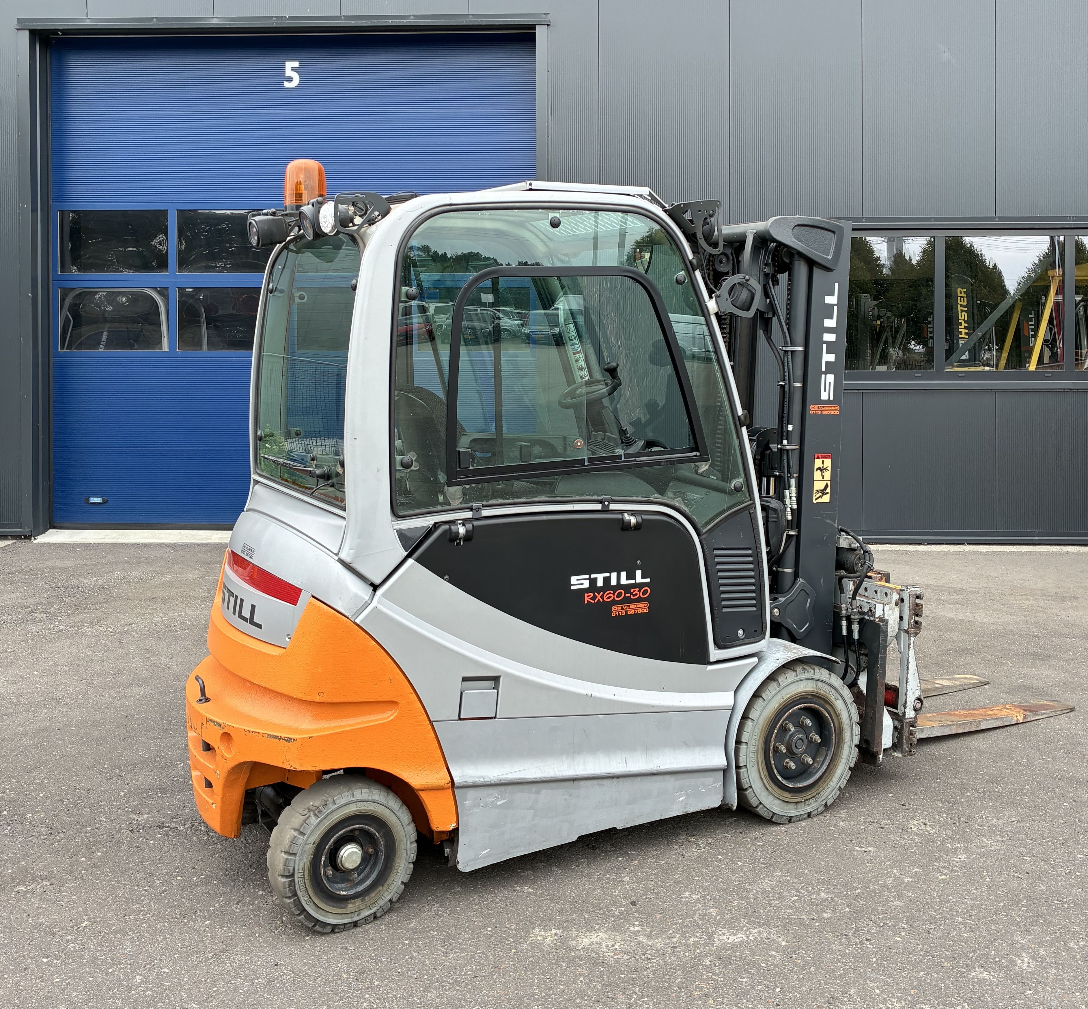 STILL RX 60-30 van bouwjaar 2019. Zeer compleet uitgevoerd met triplo mast / volledige cabine / mini hendels / wegverlichting / 4 hydraulische functies / etc..